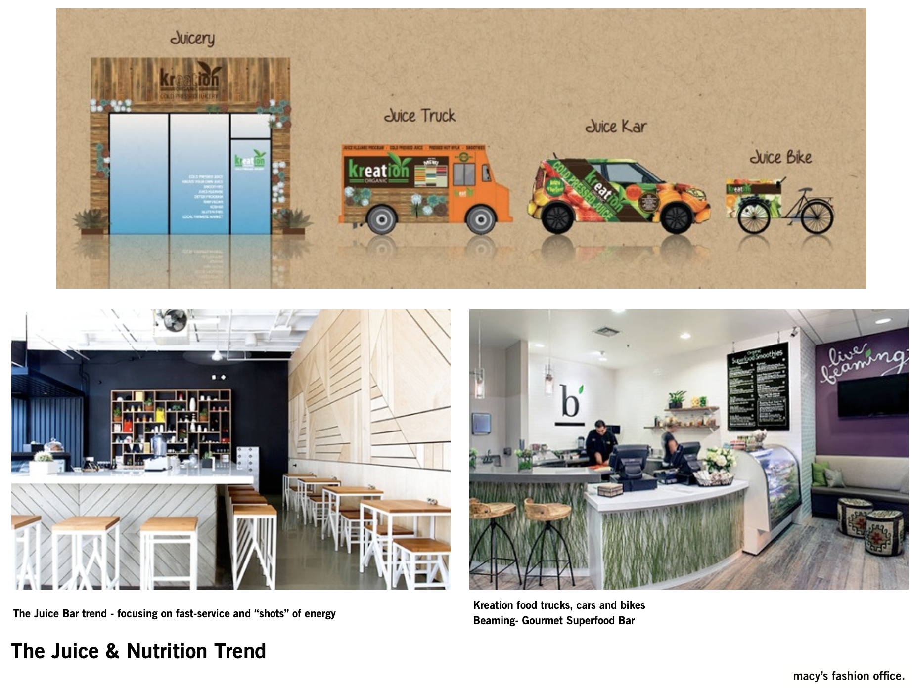Macy’s X Juice Press | In October 2015 Abbey identified the white space opportunity at Macy’s as consumers began focusing on Health + Wellness. Abbey investigated all aspects of the wellness journey to feeling good with a thorough deep dive which ultimately resulted in a Juice Press strategic partnership on Macy’s Activewear floor in November 2016.
